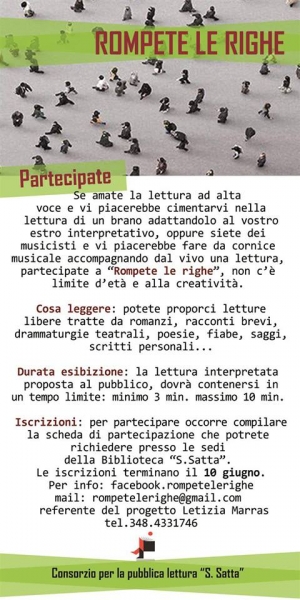 Domani 20 giugno alle ore 19.00, presso i locali della Biblioteca Satta, si svolgerà un incontro di lettura interpretativa organizzato dal Consorzio per la pubblica lettura. L'evento prevede una partecipazione attiva degli spettatori che potranno cimentarsi, senza limiti di età , nella lettura seguendo liberamente la propria inclinazione creativa. L'unico vincolo è costituito dal tempo: minimo 3 minuti, massimo 10. L'evento, che avrà come protagonista anche l'associazione teatrale To Kaos, sarà accompagnato dalle note del saxista Luciano Sezzi.