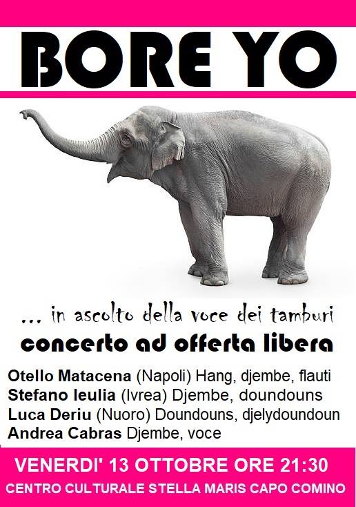 Venerdì 13, alle 21:30 presso il Centro ricreativo e culturale "Stella Maris" di Capo Comino, si terrà il concerto dei "Bore yo", «un piccolo viaggio in musica all'ascolto della voce degli strumenti a percussione». Sul palco Otello Matacena (hang, djembe, flauti), Stefano Ieulia (djembe, doundouns), Luca Deriu (doundouns, djelydoundoun) e Andrea Cabras (djembe, voce). «Vi raccontiamo - spiegano i musicisti - la storia di un'amicizia iniziata 40 anni fa e rinsaldata dal vincolo della comune passione per la musica». Ingresso a offerta.