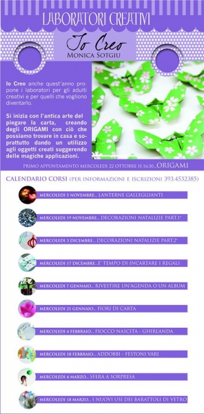 Ritorna “Io Creo”, la serie di laboratori creativi a cura di Monica Sotgiu, grafica pubblicitaria diplomata presso l'Istituto europeo di design conosciuta anche per i suoi "specchi di Sardegna" ispirati ai costumi tradizionali sardi. «Si inizia con l'antica arte del piegare la carta, creando degli origami con ciò che possiamo trovare in casa e soprattutto dando un utilizzo agli oggetti creati suggerendo delle magiche applicazioni» spiega la docente. Il primo appuntamento è previsto per mercoledì 22 ottobre alle 16.30. Seguiranno altri incontri: