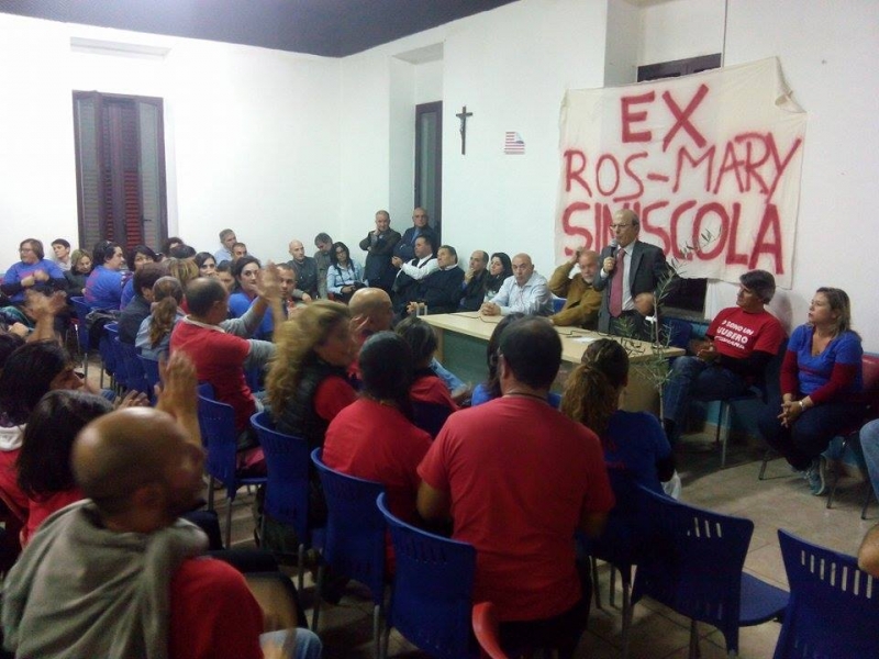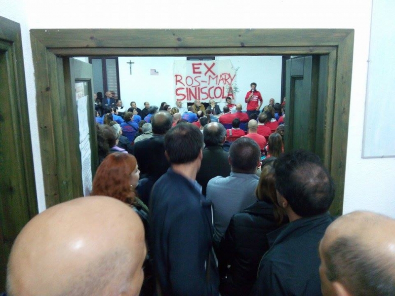 Intervenute anche Nicoletta Porru (Igea) e Luciana Murru (ex Rose Mary). Dai loro interventi emerge ancora con più forza l'idea di una vertenza unica dei lavoratori sardi, disposti a tutto per difendere la dignità di chi in questa terra crea la ricchezza. Dalle magliette rosse di Meridiana arriva poi un dono alle operaie e operai siniscolesi, una pianta di ulivo a suggellare la fratellanza. La possibilità è che venga piantata vicino alla scultura che ricorda il partigiano Tosi (nella sala c'è chi scongiura la sua piantumazione nei pressi del calzificio: «nono ca in cue si sicat!»).