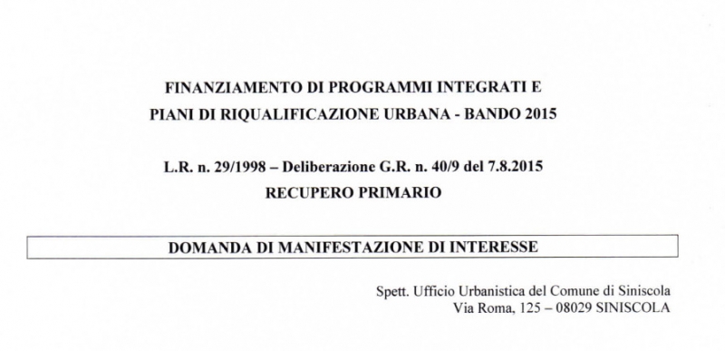 Art. 1 (Oggetto del Bando) II presente bando riguarda l'avvio delle procedure per la presentazione di proposte di recupero primario da parte dei soggetti privati per l'erogazione di contributi finalizzati a consolidare il processo di valorizzazione dell'edificato storico, in coerenza con la Legge Regionale 13 ottobre 1998 n° 29 e ss. mm. ii. "Tutela e valorizzazione dei centri storici della Sardegna" e con il vigente Piano Paesaggistico Regionale (PPR). Gli edifici dovranno necessariamente essere localizzati all'interno del centro matrice (centro di antica e prima formazione) del Comune. Le proposte presentate dai soggetti privati del Comune costituiranno la base documentale necessaria per l'elaborazione di un Programma Integrato (PI) così come definito dagli artt. 4, 9, 10, 11 e 12 della L.R. 29/1998 e ss. mm. ii.