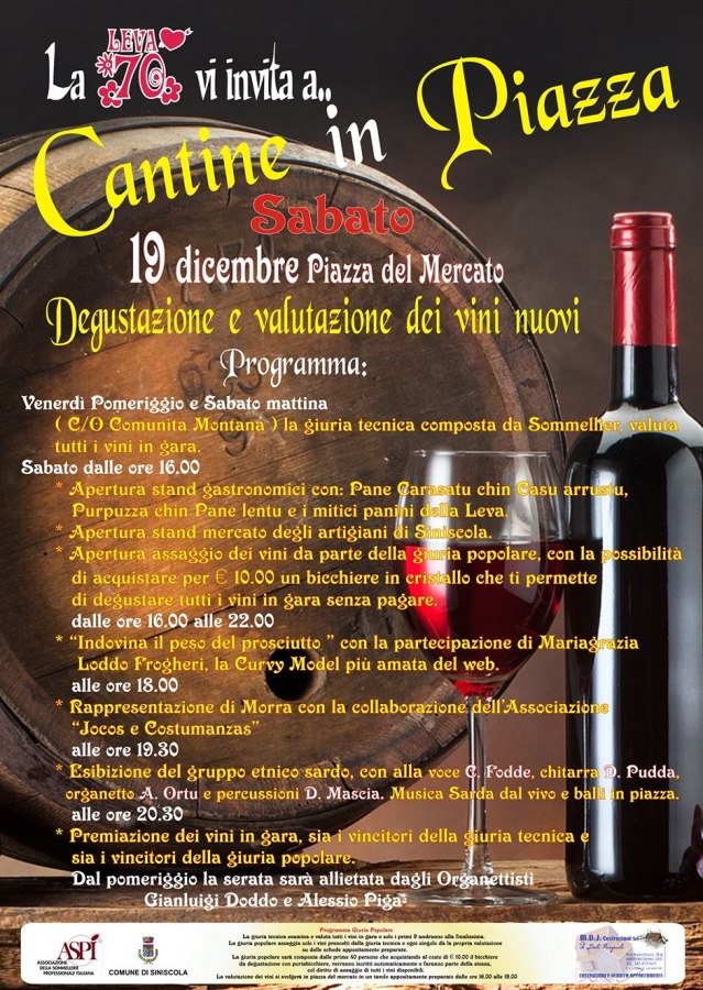 La Leva 70 organizza “Cantine in piazza”, degustazione e valutazione di vini novelli. Le produzioni enologiche in gara, circa settanta, saranno giudicate dai sommelier dell'associazione ASPI (Jaime Severi, Enzo Gamba, Franco Mucelli e Fabio Coronas).