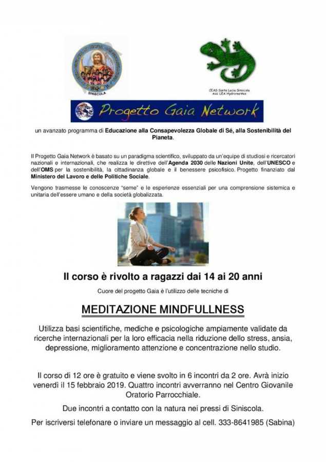 L'utilizzo delle tecniche di meditazione mindfullness sarà al centro del progetto Gaia Network, un programma di «educazione alla consapevolezza globale di sé e alla sostenibilità del pianeta» promosso dal Centro giovanile parrocchiale e dal Ceas Santa Lucia e che inizierà il 15 febbraio. «Il progetto - come affermano i promotori - fornisce una base di conoscenze ed esperienze che permettono un armonico sviluppo delle dimensioni neuropsichiche umane, attraverso un processo educativo che tiene conto delle conoscenze scientifiche, dei principi etici, delle pratiche di benessere psicofisico e della consapevolezza di Sé. Tutto questo permette uno sviluppo più armonico e completo delle persone e una consapevolezza più adatta ai bisogni e alle sfide di questo momento critico di transizione verso una società globalizzata». Il corso (gratuito e articolato in 6 lezioni da due ore ciascuna) sarà tenuto da Sabina Mele, Marialuisa Mason, Manuela Mulargia, Ercole Fenu. Quattro incontri si terranno presso il centro giovanile, due «a contatto con la natura nei pressi di Siniscola». L'8 febbraio, alle 15,45 presso il centro giovanile, si terrà una riunione di presentazione del corso.