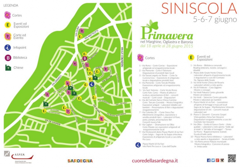Ore 15.30 Apertura “Sas Cortes bezzas” nel centro della città con esposizione, preparazione e degustazione di prodotti enogastronomici locali. Laboratori di cucina a cielo aperto di “Sa Pompia”, “Sa Suppa Siniscolesa”, “Su Pane carasatu”, “dal latte al formaggio”, “dalle api al miele”, di dolci tipici e altri prodotti del territorio, laboratori didattici su temi ambientali ed archeologici, attività guidata di ballo sardo, mostre fotografiche e di pittura, allestimenti etnografici concerti musicali e presentazione di libri.